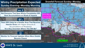 We are looking at partly sunny skies for tonight with a high of 49. Tonight we will have a chance of rain and that rain will mix with snow likely in the early Thursday morning hours as we'll see a low of 32. The National Weather Service in St. Louis says most of the region will see some light rain late this evening t...