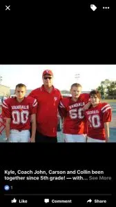 With John’s love of sports, he chose to share his talents and coach VYO football. He coached Collin’s 5th, 6th, 7th and 8th grade team. He had a strong bond with the boys he coached and this bond continued as the boys went into high school.