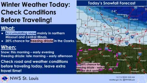 ...WINTER WEATHER ADVISORY IN EFFECT FROM 10 AM TO 6 PM CST SATURDAY... * WHAT...Snow expected. Total snow accumulations up to two inches. * WHERE...Fayette IL, Montgomery IL, Greene IL, and Macoupin IL Counties. * WHEN...From 10 AM to 6 PM CST Saturday. * IMPACTS...Plan on slippery road conditions. * ADDITIONAL DETAIL...